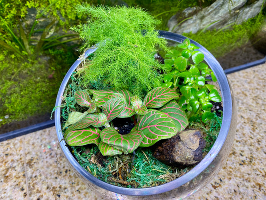 Bring the serenity of the outdoors into your home with this beautifully crafted Nature Inspired Terrarium. This lush miniature ecosystem features a harmonious blend of vibrant moss, delicate ferns, and hand-selected ornamental stones, all enclosed in a sleek glass vessel. Perfect as a centerpiece or a thoughtful gift, this terrarium is low-maintenance and designed to thrive with minimal care. Whether you're looking to add a touch of green to your desk, shelf, or coffee table, this terrarium offers a tranquil escape into nature's beauty. Each piece is uniquely assembled, ensuring no two terrariums are exactly alike.