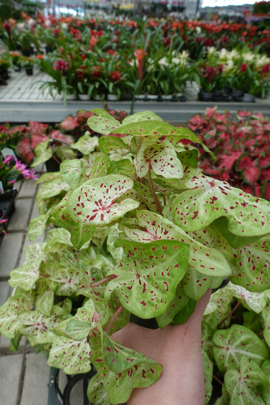 Caladium ‘Miss Muffet’ – Dwarf Shade Plant with Lime Green Leaves & Burgundy Speckles
