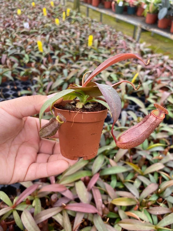 The Nepenthes Rebecca Soper is one of the most popular tropical pitcher plant hybrids, available here in a wholesale 45-pack case. Each plant comes in a 2-inch pot, perfect for resellers, classrooms, or gifts. This hybrid is prized for its rich red pitchers, strong growth, and adaptability, making it one of the easiest Nepenthes to grow.