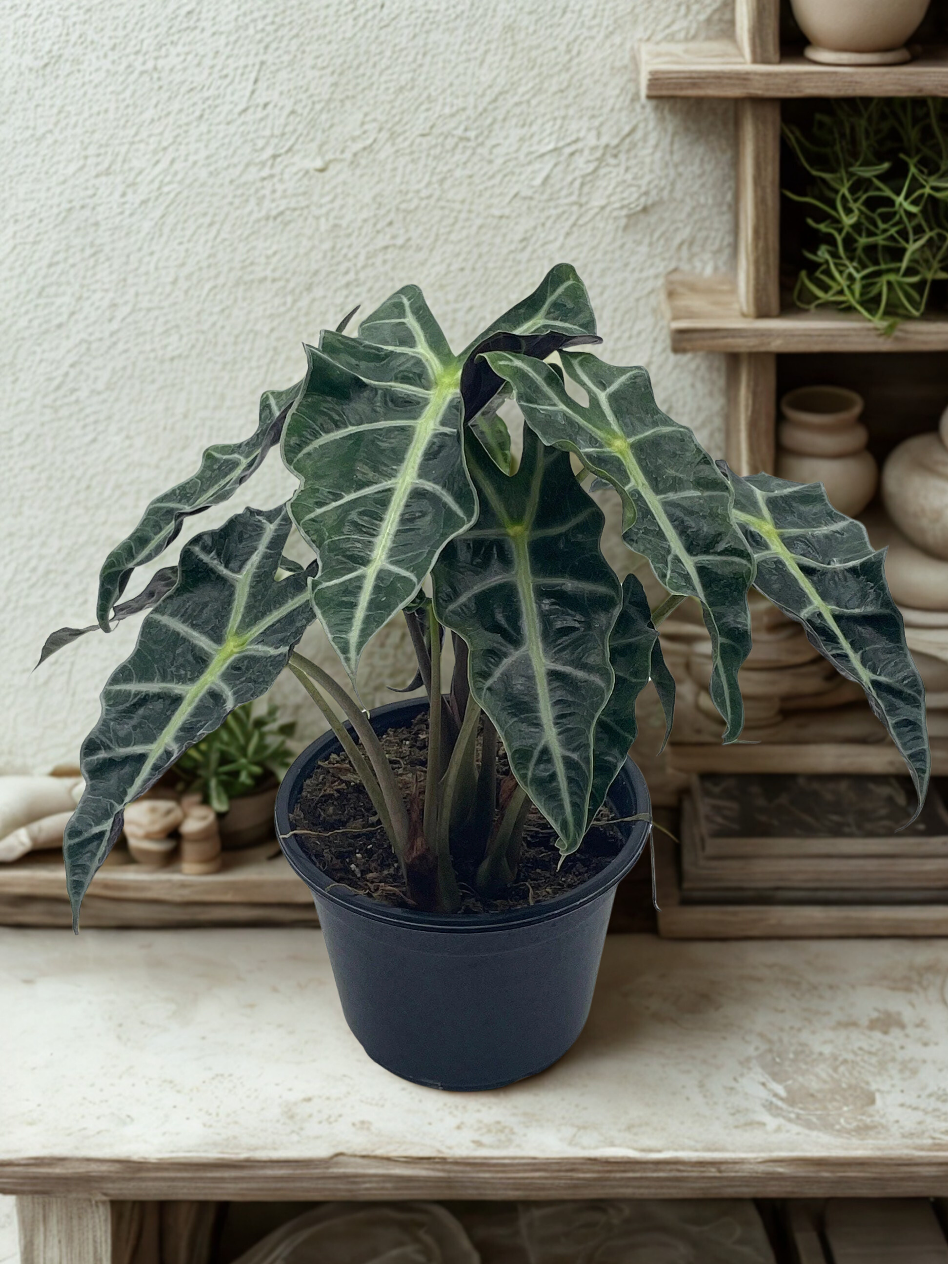 A beautiful 6" Alocasia featuring bold, tropical foliage and eye-catching leaf shapes. Known for its dramatic appearance and lush growth, this plant adds instant character to desks, shelves, and small indoor spaces. A great choice for plant lovers looking for a statement plant in a compact size. Available soon at EnchantedGrow.com.